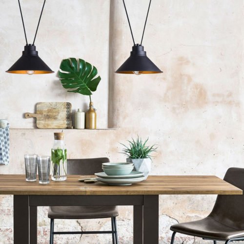 Pour le salon, pièce conviviale et de détente, l’idéal est de choisir un lustre suspendu utilisant des matériaux clairs : macramé naturel ou cannage en rotin. Vous avez la possibilité d’y ajouter des luminaires naturels en abat-jour fabriqué en bambou ou lin gris.