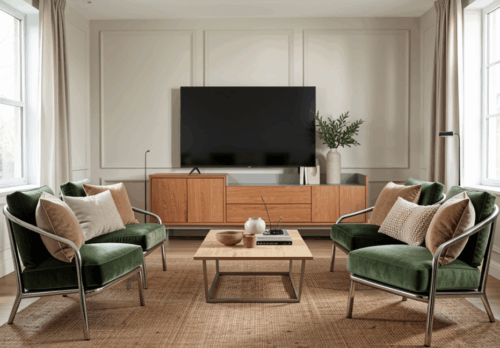 Fauteuil design en velours vert émeraude disposé dans un salon moderne avec buffet en bois.