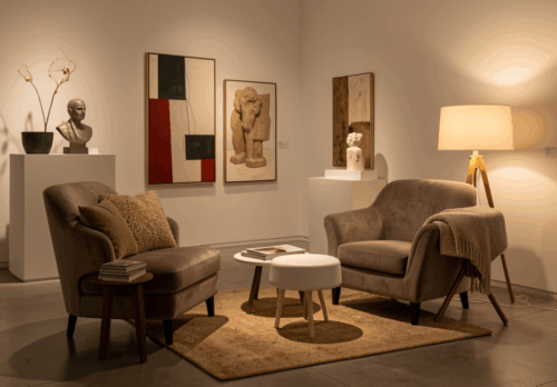 Salon à l’esprit galerie d’art, où le mobilier aux courbes organiques rencontre des pièces sculpturales sous une lumière tamisée.