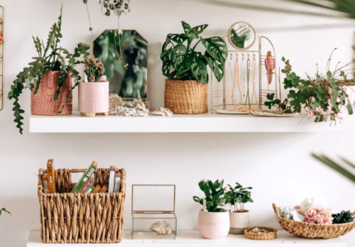 Étagères flottantes décoratives avec plantes d’intérieur, porte-bijoux doré, miroirs géométriques et paniers de rangement