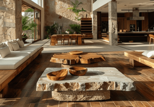 Salon moderne mêlant design biophilique, mobilier en bois massif sculpté et murs en pierre naturelle