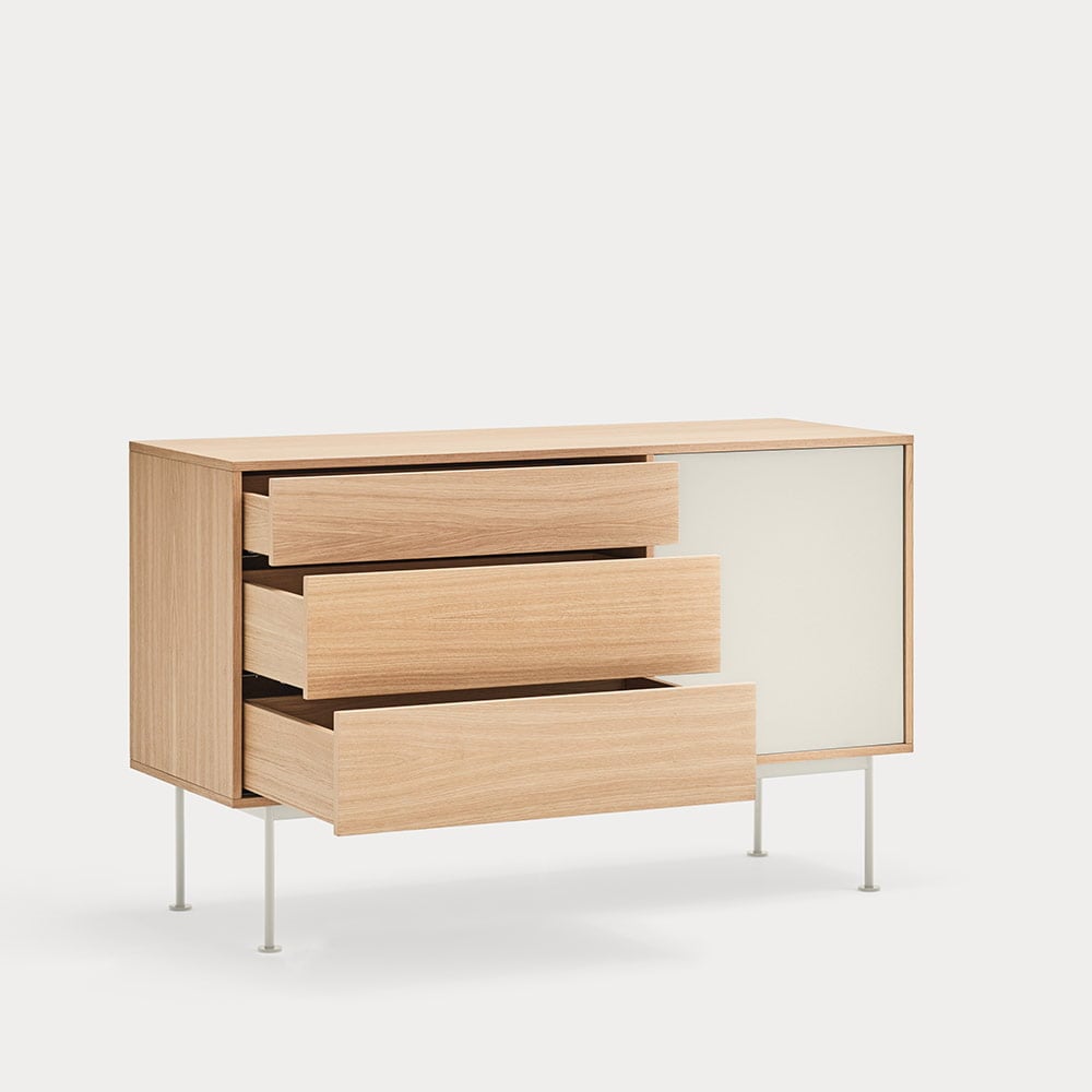 Craquez sans hésiter Buffet Bas Yoko 1 Porte 3 Tiroirs ! Pratique, ses multiples espaces de rangement vous faciliteront la vie au quotidien : plateau relevable avec rangement en dessous, coffre pour les bouteilles et étagère inférieure pour disposer magazines et télécommandes !