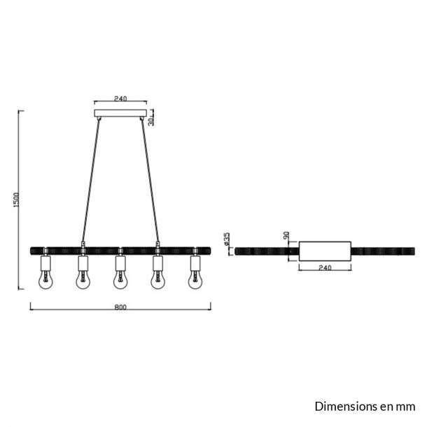 Un charme authentique et un look contemporain, on adore cette suspension EINAR ! Fabriquée sur une structure en métal noir mat et en corde naturelle, elle possède cinq points lumineux et arbore un style moderne tendance qui ne passera certainement pas inaperçu dans votre décoration intérieure. Parfaite dans votre salon pour instaurer une ambiance lumineuse unique et chaleureuse, elle sera tout aussi idéale au-dessus de votre table à manger et sera la pièce maitresse de vos moments de partage ! La suspension EINAR trouvera aussi sa place dans une grande entrée avec une belle hauteur sous plafond pour un éclairage plus fonctionnel et accueillant. Notre astuce tendance : optez pour de belles ampoules déco avec filaments par exemples ou bien pour des ampoules colorées format XXL et donnez une touche vintage sublime à votre suspension barre EINAR. Luminaire équipé de cinq douilles E27 compatibles avec cinq ampoules d’une puissance maximale de 40W chacune, soit 5x40W (ampoules non incluses). Dimensions : hauteur 150cm (hauteur réglable) x longueur 80cm x longueur socle 24cm.